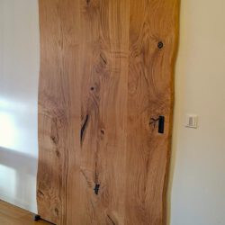 Wir haben eine Schiebetür in Eiche massiv produziert und montiert. An den beiden Seiten endet Tür mit einer Baumkante.