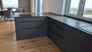 Einbauküche mit matter grauer Oberfläche. Die dünne Arbeitsplatte ist in Betonoptik.