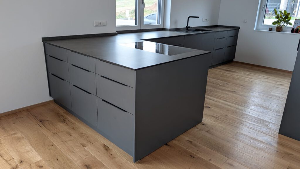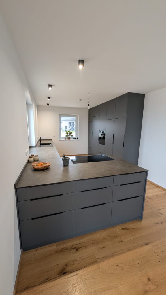 Einbauküche in CPL grau matt. Die Arbeitsplatte ist aus dünner Platte in Betonoptik. Die Hochschränke bieten genügend Stauraum.